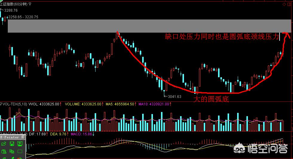 上证60分钟级别显示目前处于大圆弧底形态,今日回补了4月16日的缺口,马上就面临下一个缺口压力同时也是圆弧底颈线位压力,指标MACD呈多头趋势,但是,60分的后成交量有所萎缩,并没有放出量,明日需要补量才能继续上涨。