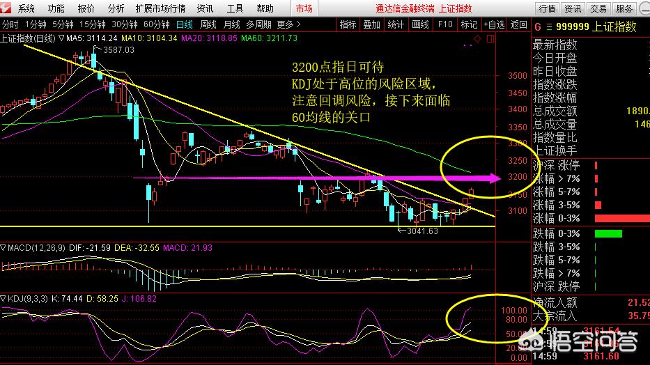 大盘如今再次临近3200点位,可能承压回调,同时这个点位附近还有60均线的压制,总体上我们依然看好未来的方向,但是短期的风险必须考虑在内,比如现在KDJ指标已经上探到100高风险位置,随时有拐头向下的风险,所以要注意接下来可能的回调。