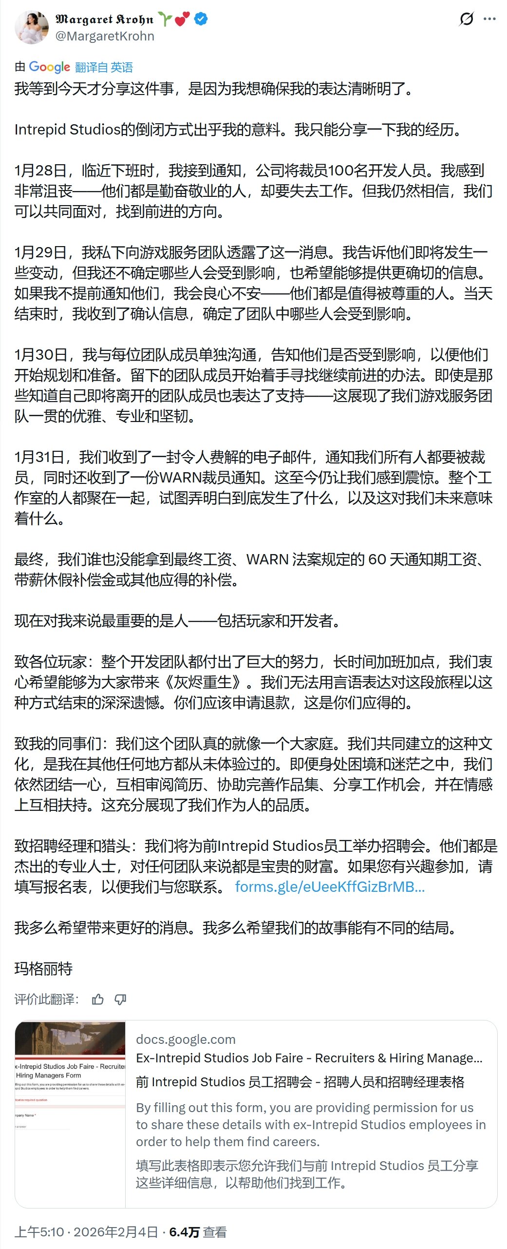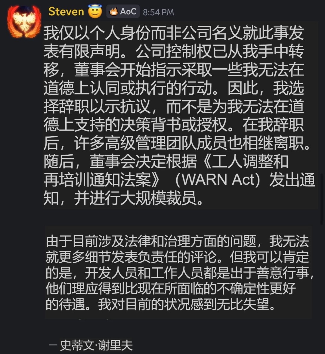 危机的开端是多名Intrepid Studios员工在LinkedIn上发布求职贴。其中,前通讯总监玛格丽特·克罗恩证实:“所有人都被解雇了。这太糟糕了。”随后,公司创始人兼《创世灰烬》创意总监史蒂文·谢里夫在游戏社区上发布声明,称公司的控制权已从他手中转移,董事会采取了其“在道德上无法同意或执行”的行动,因此他选择辞职抗议。其离职引发了核心领导团队的集体出走,董事会随后决定依据《WARN法案》启动大规模裁员。
