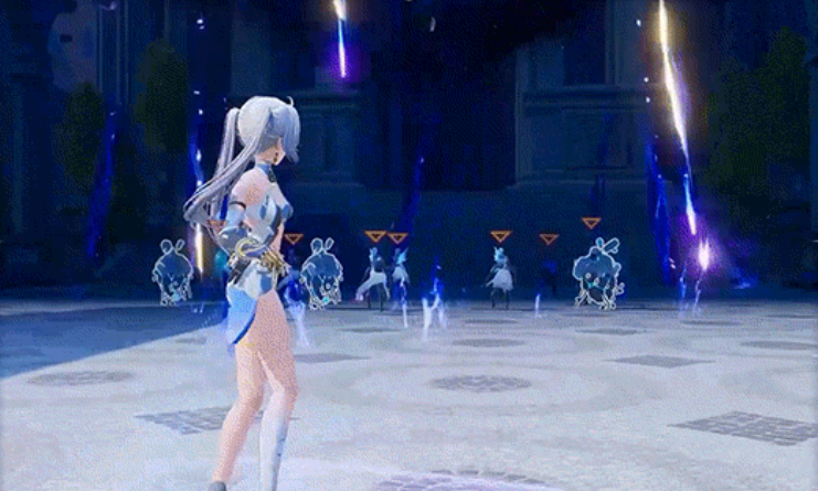 支援技「星骸锐雨」: 召唤持续落下的星骸飞剑,角色缓慢前移,对前方扇形区域多次打击,造成动能范围伤害。