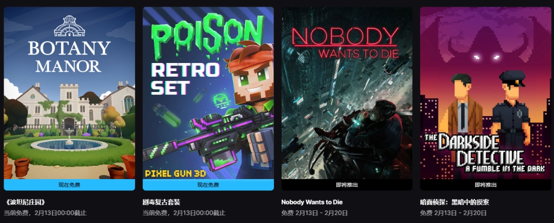 Epic本周送出的是《Botany Manor》和《Pixel Gun 3D》剧毒复古套装(需基础游戏),截止至2月13日00:00,一旦领取永久入库。下周送出的游戏是《Nobody Wants to Die》和《暗面侦探:黑暗中的摸索》,2月13日开放领取,截止至2月20日。