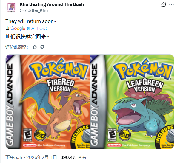 爆料人Riddler_Khu在平台发文称:“他们很快就会回来~”,并配上了《宝可梦 火红》与《宝可梦 叶绿》的封面包装图。推文未透露任何关于“回归”具体形式的细节。该爆料人素以发布模糊预告、缺乏上下文信息著称,因此玩家需谨慎对待。