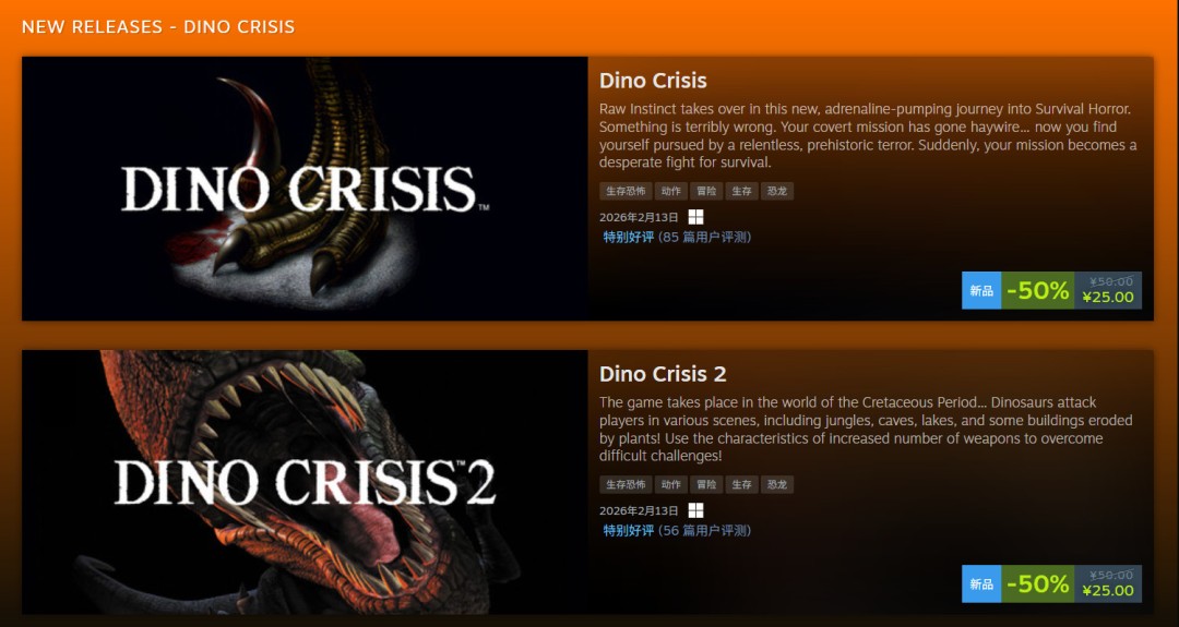此外,Capcom经典作品《恐龙危机》《恐龙危机2》现已登陆Steam,发售特惠均25元。