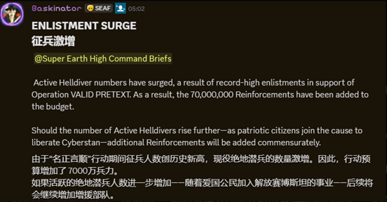 与此同时,超级地球政府另一份公告也随之到来:增援兵力有限,如果我们2亿的增援额度在生化斯坦解放前耗尽,本次“名正言顺行动”即正式宣告失败。