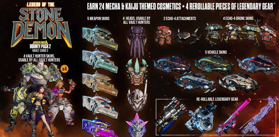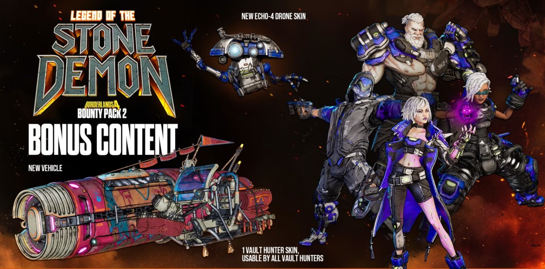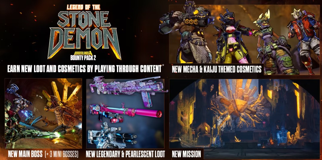 2K和Gearbox宣布《无主之地4》赏金包2:石魔传奇(Legend of the Stone Demon)将于2月26日上线。迎战可怕的岩石恶魔,以及三名全新小Boss,并猎取全新的珠光级稀有度装备、全新传奇物品、24件装扮物品等丰富内容!