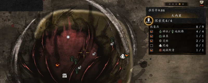 《仁王3》中收藏品(重要道具)数量丰富,各区域获取方式不同。平安京·大内里区域包含以下关键收藏品:遗发(用于提升技能点)、灵脉、地狱附身、温泉、秘传书、传书等。