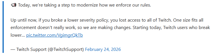 游戏直播平台Twitch公布违规封禁新规 惩罚限制放缓