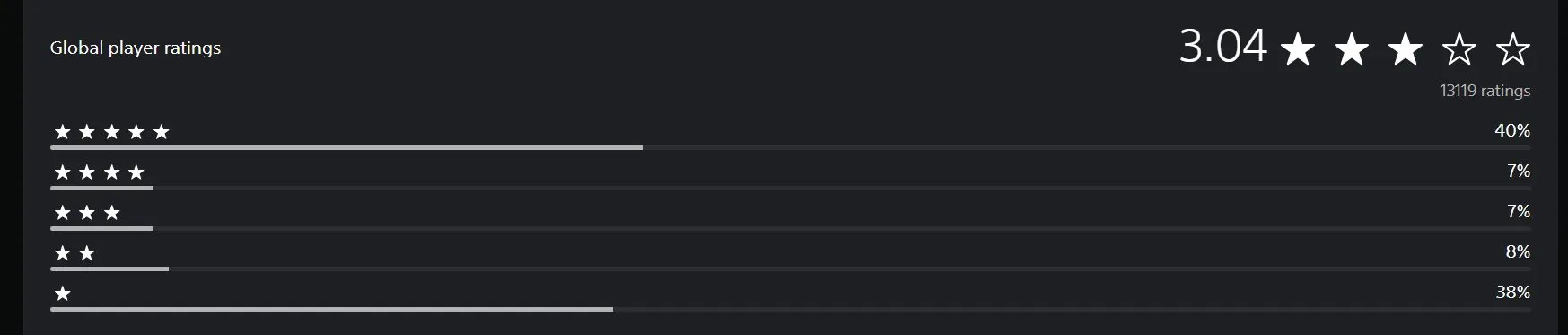 目前《马拉松》在全球PSN上共有超过13119条评价,尽管40%的用户给出5星好评,但也有差不多数量的用户给出1星最差评价,占比38%。