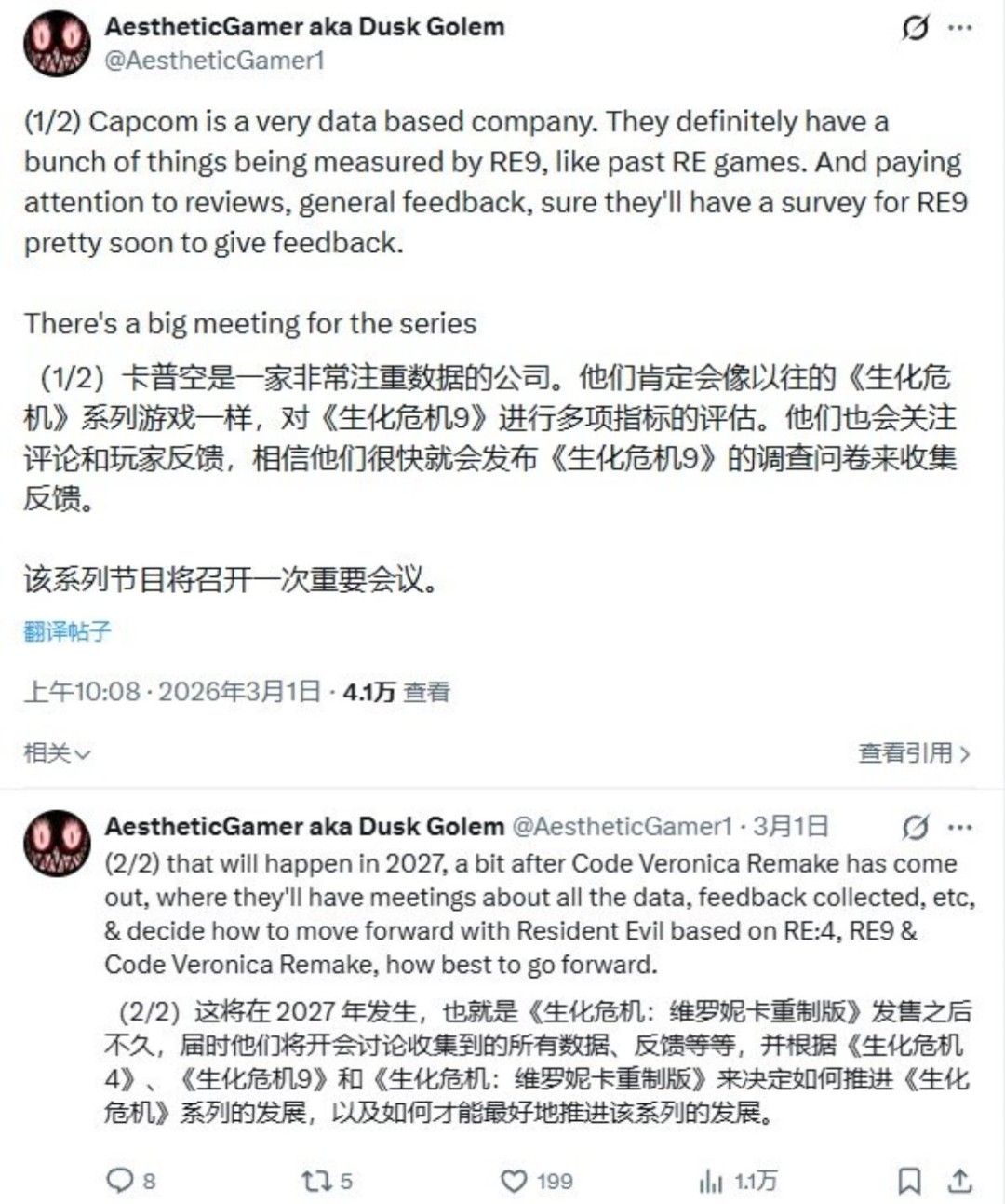 届时,公司将综合最近三部作品——《生化危机4 重制版》、《生化危机:安魂曲》以及《代号维罗妮卡 重制版》的市场表现与玩家反馈,再对系列下一步走向做出战略决策。Dusk Golem此前曾准确预测里昂将在《安魂曲》中回归,其爆料具有一定可信度。