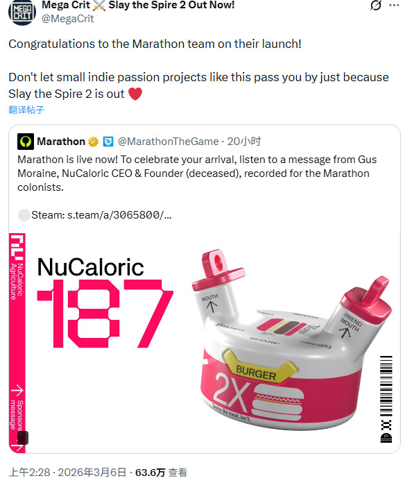 今天,《杀戮尖塔2》开发商Mega Crit发推,庆祝同一天发售的《马拉松》,还温馨提示“不要因为《杀戮尖塔2》发售了,就错过像(《马拉松》)这样的‘小型独立热情项目’(Don't let small indie passion projects like this pass you by just because Slay the Spire 2 is out)”。