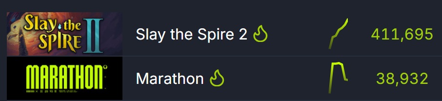 《杀戮尖塔2》Steam同时在线峰值现已超过了41万,与此同时,同一天发售的《失落星船:马拉松》Steam同时在线峰值只有8.8万人。一个是来自小型团队的独立游戏,一个据说是制作成本超过2.5亿美元的西方3A大作,讽刺意味十足。